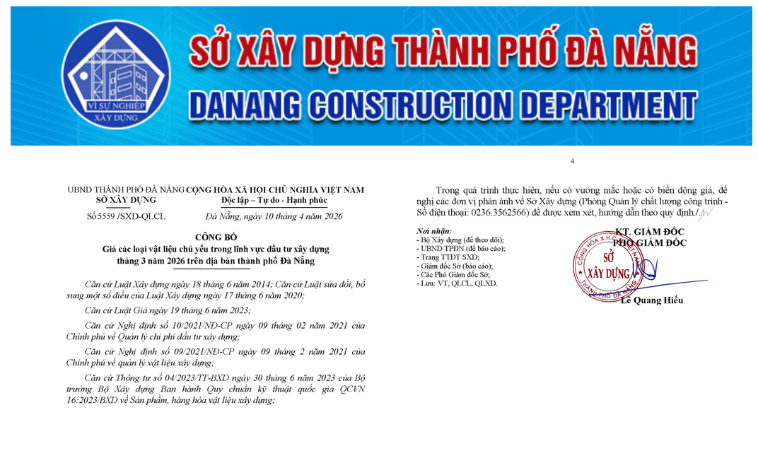 Theo thông báo chính thức từ Sở Xây dựng Đà Nẵng (tháng 3/2026), phụ gia chống thấm Lásen+ (bao 2kg) đã được công bố giá tham khảo trên thị trường TP. Đà Nẵng. Đây là cơ sở quan trọng giúp chủ đầu tư, nhà thầu và đơn vị thi công dễ dàng lập dự toán, kiểm soát chi phí và lựa chọn giải pháp chống thấm hiệu quả.