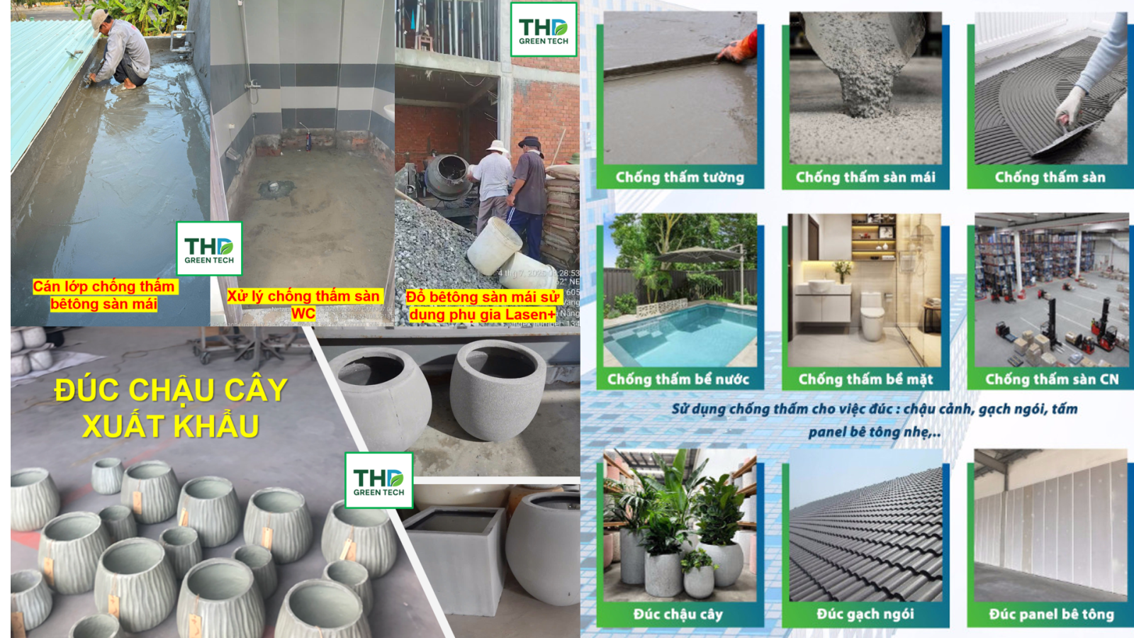 Phụ gia chống thấm dạng bột LáSen+ là sáng chế độc quyền do Công ty THD và KH2O cùng phát triển, mang đến giải pháp chống thấm toàn diện cho ngành xây dựng: đã biến một yếu tố thường gây hại (Ca(OH)₂ dư thừa) thành lớp bảo vệ hữu ích. Đến nay, THD Green Tech phát triển mạnh theo hướng giải pháp chống thấm toàn khối với dòng phụ gia chống thấm dạng bột Lásen+, ứng dụng linh hoạt cho nhiều hạng mục như tường ngoài, sàn mái/sân thượng, ban công, nhà vệ sinh, tầng hầm, bể chứa nước… Nhờ định hướng lấy hiệu quả dài hạn làm trung tâm, THD dần trở thành đối tác tin cậy của nhiều Chủ đầu tư, Nhà thầu và đội thi công trong việc xây dựng các công trình bền – sạch – an tâm theo thời gian.