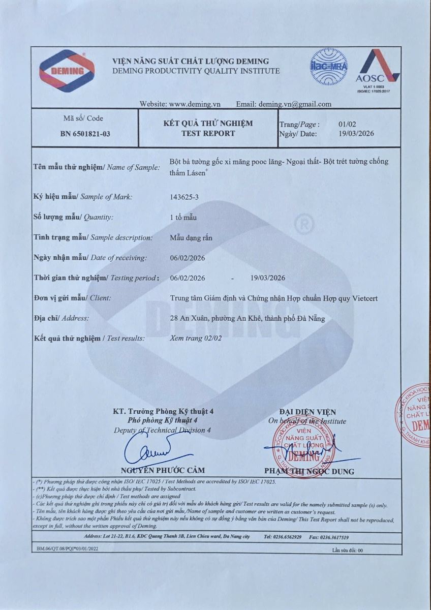 Bột trét tường nội ngoại thất kháng nước Lasen+ phù hợp tiêu chuẩn TCVN 7239:2014 được Trung tâm giám định và chứng nhận Hợp chuẩn Hợp quy VietCert cấp ngày 20/03/2026.