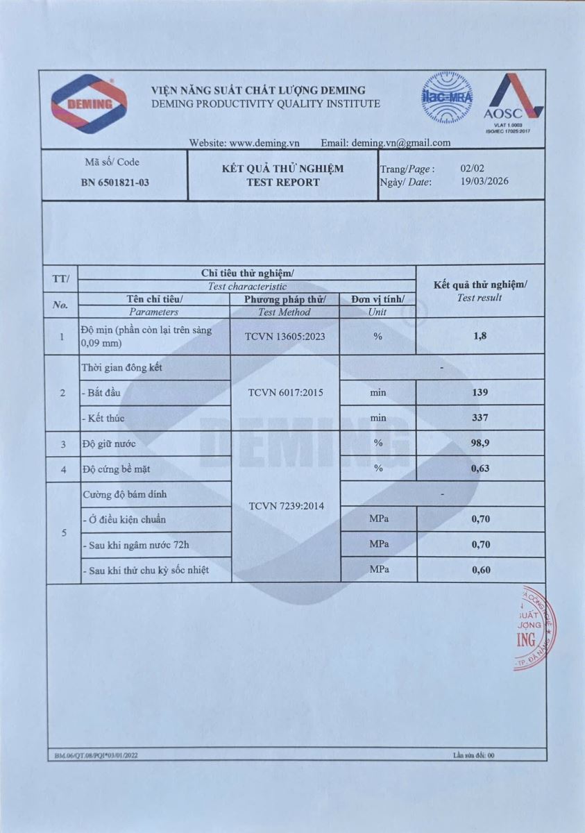 BỘT BẢ TRÉT TƯỜNG - KẾT QUẢ THỬ NGHIỆM