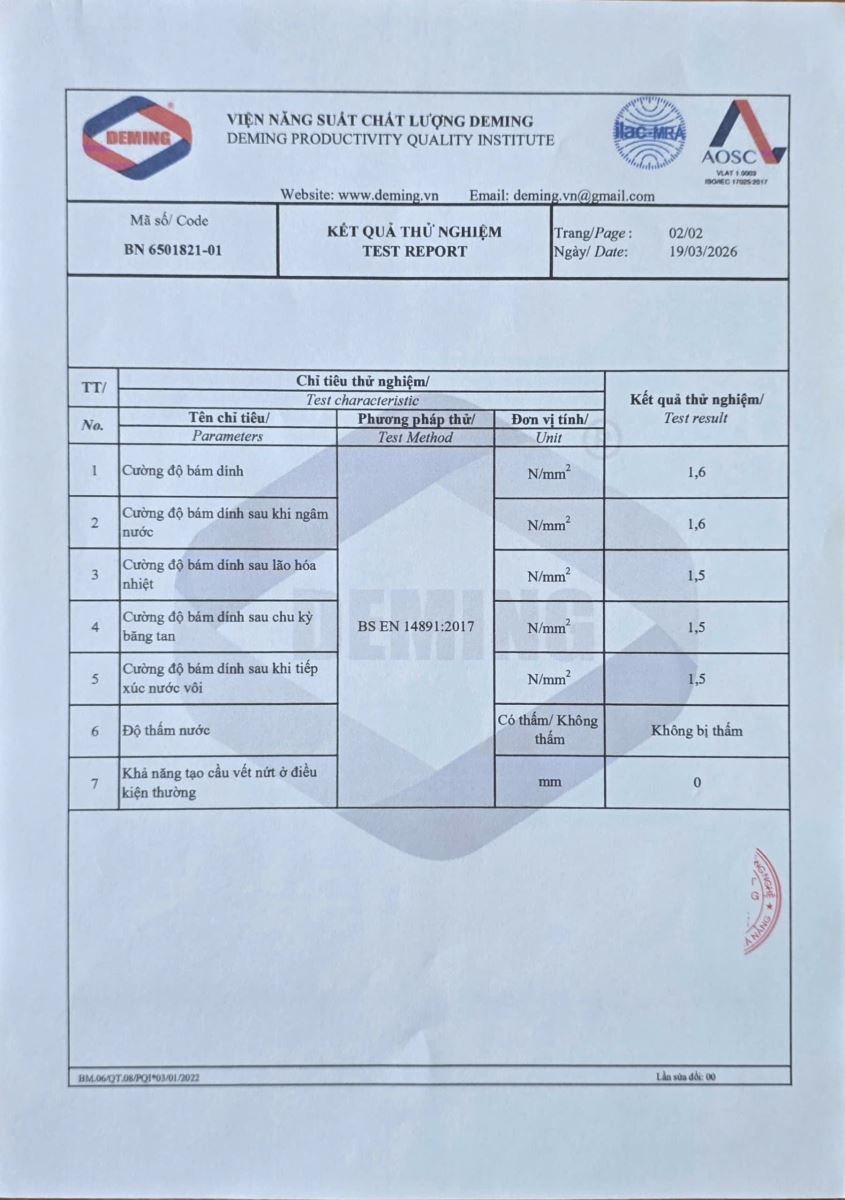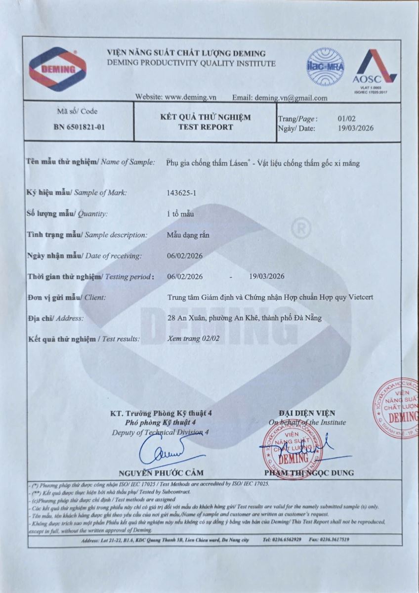 Phụ gia chống thấm LáSen+ phù hợp tiêu chuẩn BS EN 14891:2017 được Trung tâm giám định và chứng nhận Hợp chuẩn Hợp quy VietCert cấp ngày 20/03/2026.