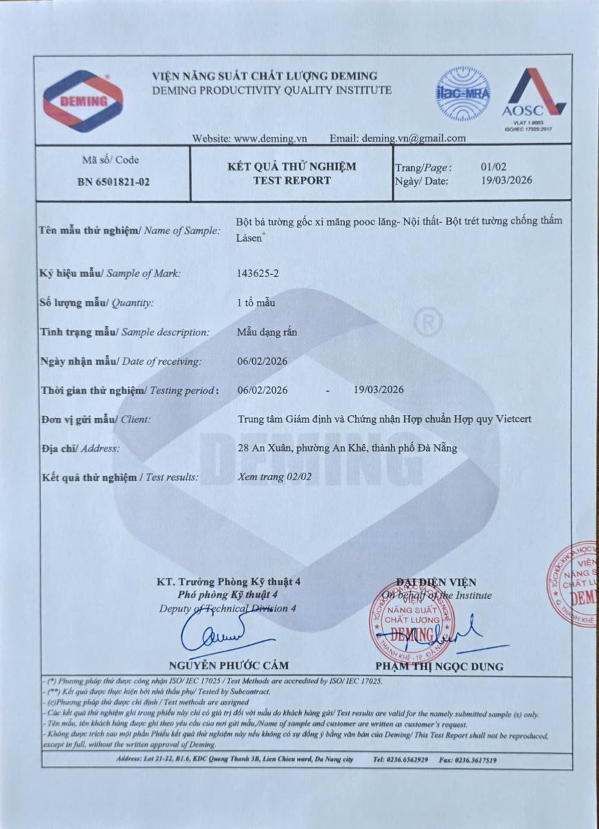 Bột trét tường nội ngoại thất kháng nước Lasen+ phù hợp tiêu chuẩn TCVN 7239:2014 được Trung tâm giám định và chứng nhận Hợp chuẩn Hợp quy VietCert cấp ngày 20/03/2026.