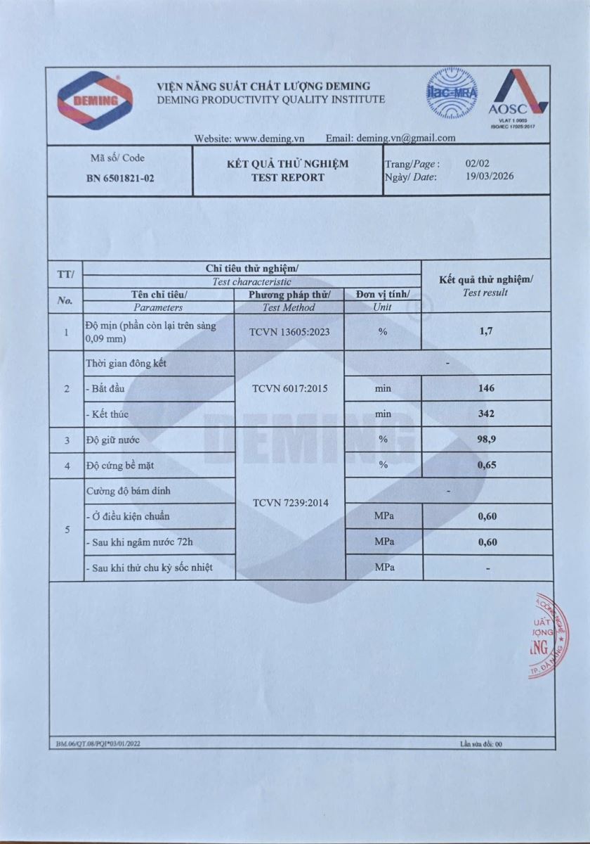 BỘT BẢ TRÉT TƯỜNG - KẾT QUẢ THỬ NGHIỆM