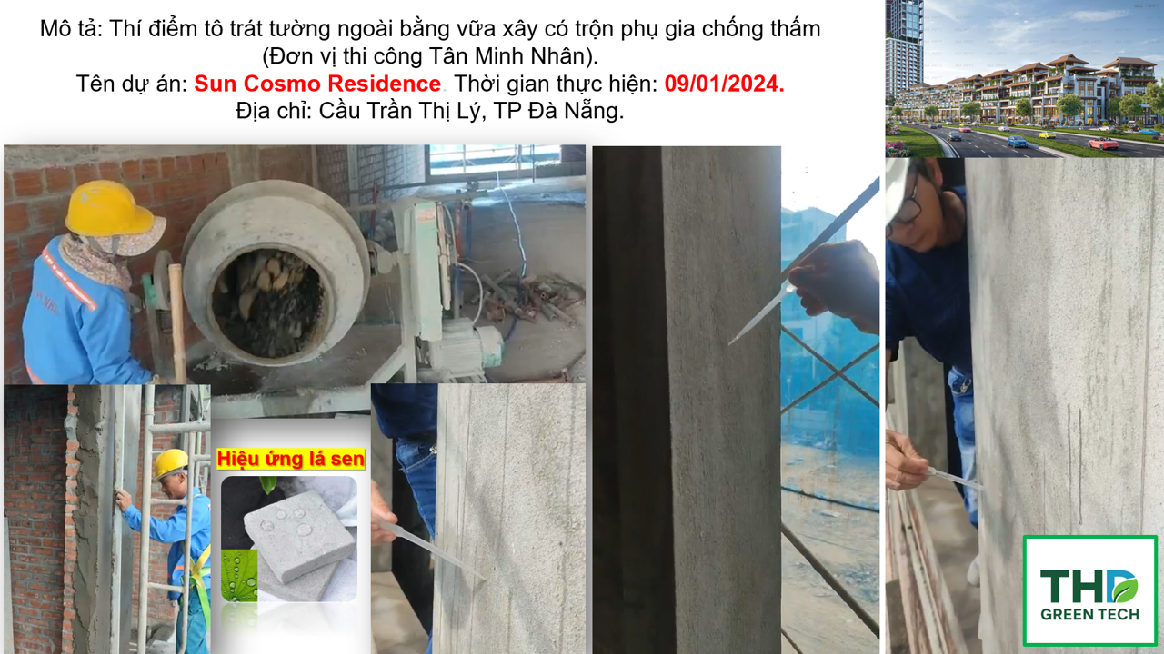 Mô tả: Thí điểm tô trát tường ngoài bằng vữa xây có trộn phụ gia chống thấm (Đơn vị thi công Tân Minh Nhân).